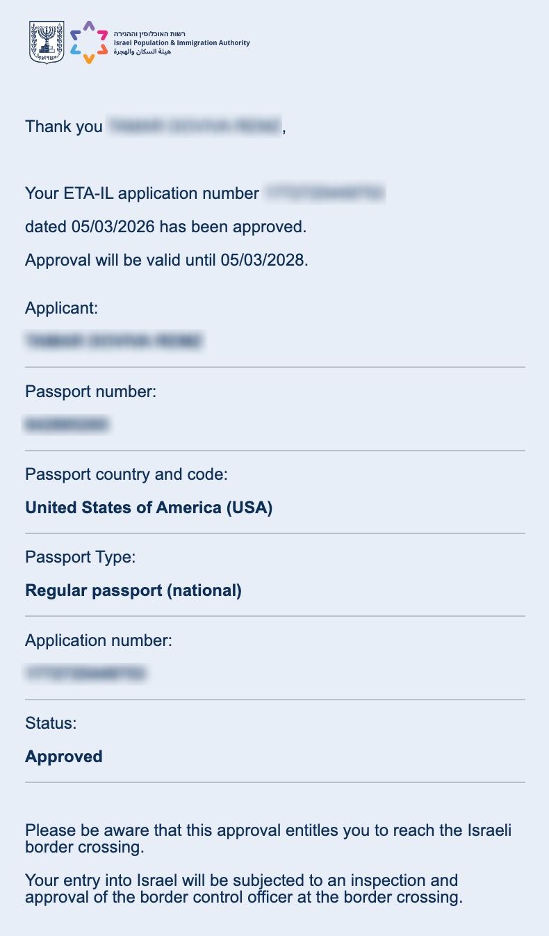 Below is a real example of an approved ETA-IL confirmation document. Personal information has been redacted for privacy.